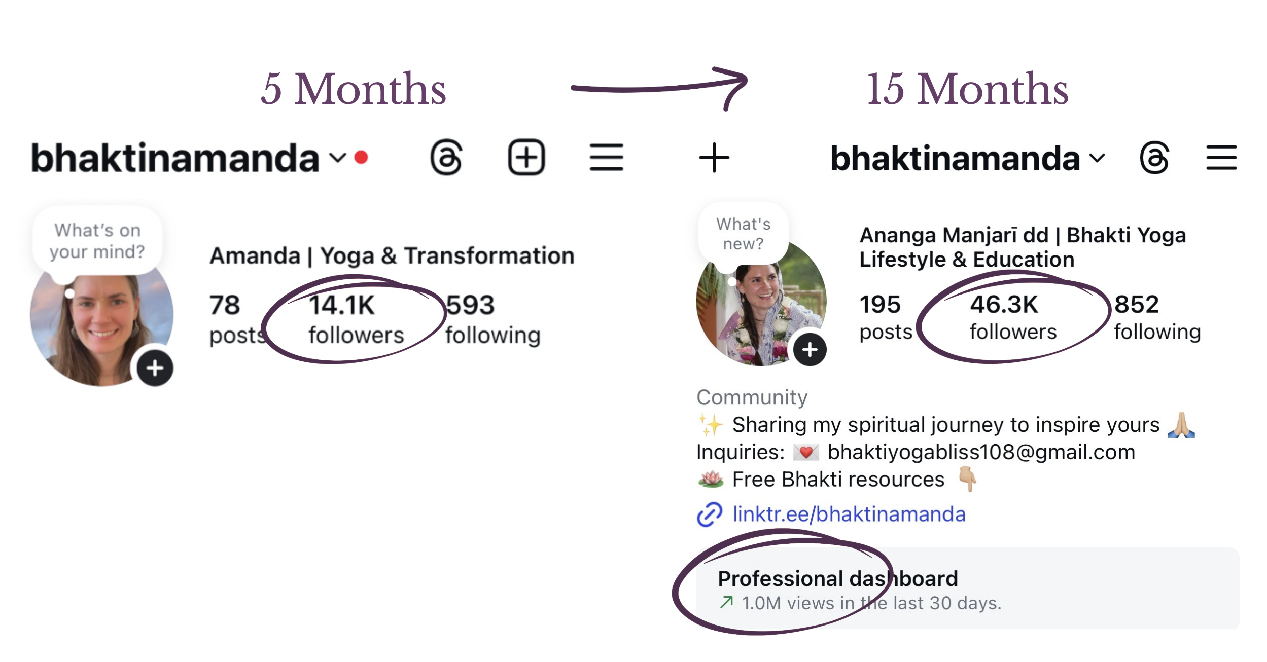 When I first started posting on Instagram, I didn't have much of a plan. I had just moved in with a monk to dedicate myself to the practice of Bhakti yoga. I decided to document my spiritual journey for fun. Then, through tons of research and trial and error, I learned what content works, studied why it works, and figured out how to create it sustainably and authentically. Then something unexpected happened: my account blew up to 45,000 followers. I attracted an aligned audience and built a niche community that trusts me.